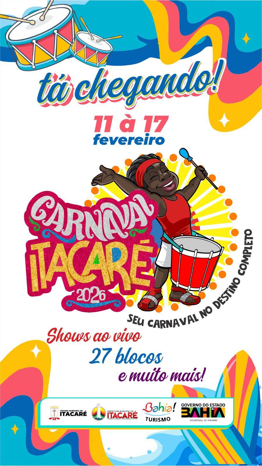 A Prefeitura de Itacaré reforça o convite para que todos se programem e venham viver o Carnaval 2026 em uma das cidades mais encantadoras da Bahia.